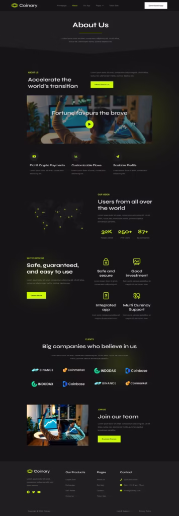 Coinary is a modern Elementor Pro Template Kit with a dark style UI that is perfect to create a pro-level WordPress-based website for Bitcoin, Blockchain, Cryptocurrency, Crypto Landing Page, ICO Agency, Fintech Company, and all kinds of Financial Technology websites.