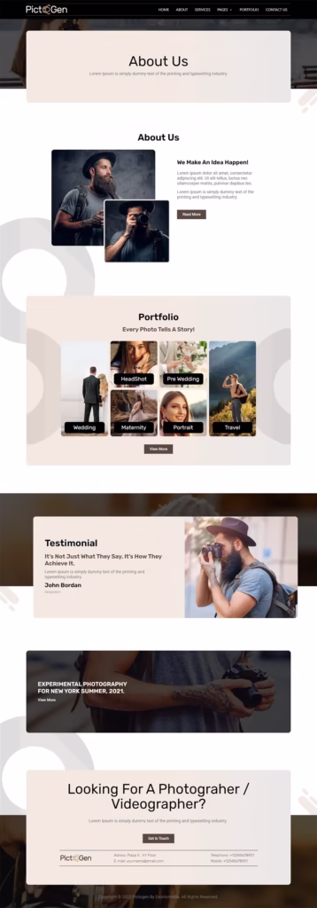 The Pictogen is an Elementor Template kit of classic and elegant templates for photography websites, fashion portfolios, and photo galleries. It includes section blocks and complete pages, providing everything you need to start your next photography website project.Pictogen Creative Photography Elementor Template Kit